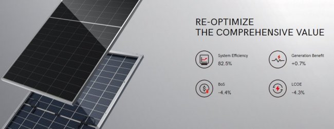 Двухсторонние модули мощностью 655 Вт и 670 Вт имеют размеры 2384 мм x 1303 x 35 мм и весят 38,5 кг. Их эффективность преобразования энергии на передней стороне составляет от 21,09% до 21,57%. Напряжение холостого хода составляет от 43,7 В до 44,3 В, а ток короткого замыкания — от 19,09 А до 19,24 А. Остальные характеристики такие же, как у продуктов мощностью 595 Вт и 610 Вт.