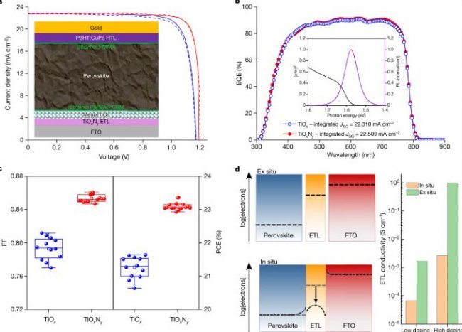 Ученые разработали процесс обратного легирования для изготовления электронно-транспортных слоев из оксида титана, легированного азотом, которые обладают выдающимися характеристиками переноса заряда. Включив этот материал для переноса заряда в солнечные элементы на основе перовскита, они создали элементы площадью 1 см2 с сертифицированной стационарной эффективностью 22,6%.