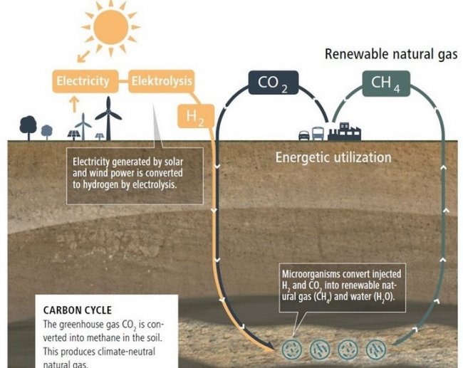 Под землей «за относительно короткое время», как заявляют разработчики, микроорганизмы надцарства археи преобразуют водород и углекислый газ в воду и метан, который затем перекачивается на поверхность. Здесь он может использоваться как экологически чистое топливо, в том числе в зимние месяцы, когда мощностей солнечных электростанций недостаточно.