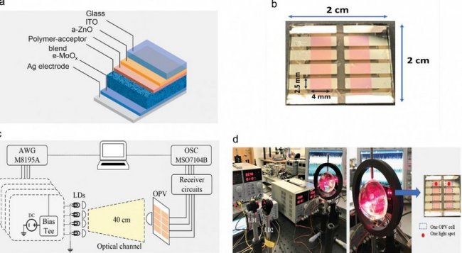 Четыре такие фотоэлемента объединили в панель. В ходе экспериментов она продемонстрировала способность обеспечить беспроводную оптическую связь со скоростью 363 Мбит/с, одновременно вырабатывая 11 мВт электроэнергии. В качестве источника информации использовалась установка из четырех лазерных диодов, каждый из которых передавал отдельный сигнал.