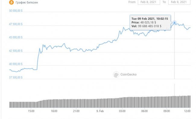 К концу 8 февраля крупнейшая в мире криптовалюта выросла на 14%, установив новый рекорд – более 44 000 долларов (на момент публикации статьи – свыше 47 000 долларов). Индекс Grayscale Bitcoin Trust вырос на 20,6% в – это самый высокий показатель с середины января. Золото подскочило более чем на 1%, в то время как Ethereum, другая криптовалюта, также взлетела до рекордного уровня.