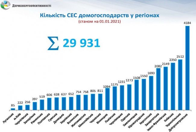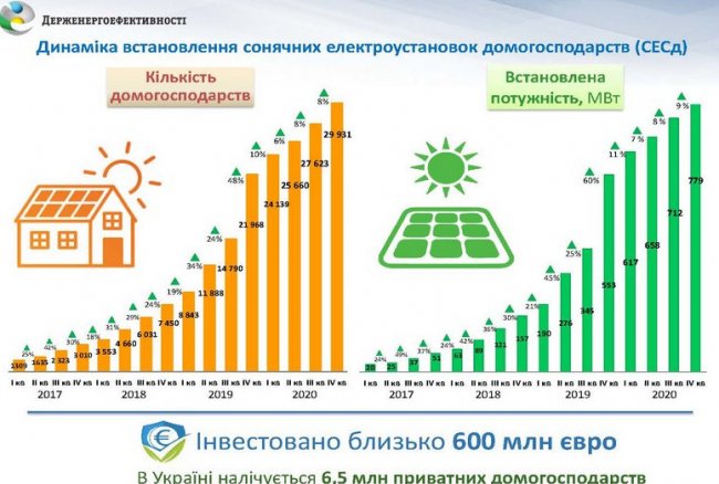 По информации Агентства Держенергоефективности на конец 2020 года в Украине насчитывается более 29900 семей, которые установили домашние солнечные электростанции (СЭС). Их совокупная мощность достигает 780 МВт.