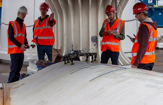 BladeBUG недавно прошел свое первое большое испытание, пройдя вверх и вниз по 50-метровой лопасти на турбине мощностью 7 МВт. Робот управляется дистанционно оператором, который проводит визуальный осмотр и неразрушающий контроль. Он также способен проводить мелкий ремонт во время своего путешествия.