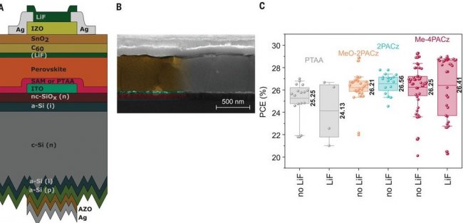 «Тандемные фотоэлектрические ячейки, в которых кремний сочетается с галогенидным перовскитом, являются многообещающим решением для преодоления существующего предела эффективности на уровне отдельного фотоэлемента, — пишут исследователи в своей статье, опубликованной в журнале Science. — Мы сообщаем о монолитной тандемной ячейке из перовскита и кремния, обладающей сертифицированной эффективностью преобразования солнечной энергии 29,15%».