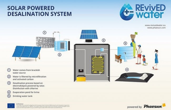 Работающая на солнечных батареях установка для обессоливания воды путем электродиализа была разработана Phaesun совместно с партнерами в рамках научно-инновационного проекта REvivED Water, стартовавшего в 2016 году и закрытого в июле 2020 года.