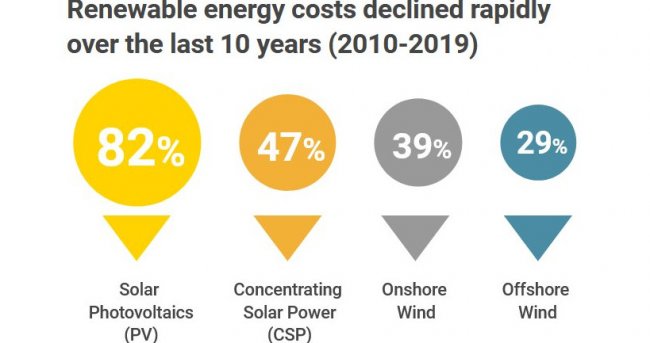 Согласно последнему отчету Международного агентства по возобновляемым источникам энергии (IRENA), в 2019 году по сравнению с 2010 годом на 82% упала стоимость выработки энергии с помощью солнечных панелей, и на 47% снизилась цена использования систем концентрированной солнечной энергии. А также на 39% подешевела энергия ветра, вырабатываемая ветрогенераторами на суше, и на 29% — ветряными установками, расположенными в океане.