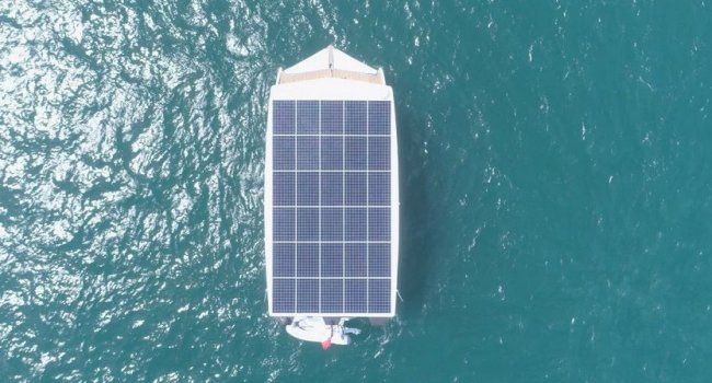 Электрический привод и возобновляемые источники энергии постепенно проникают и в морской транспорт. Сингапурская компания объявила о выпуске своего первого катамарана с солнечными панелями. Яхта способна пересекать моря без остановок, используя только солнечную энергию.