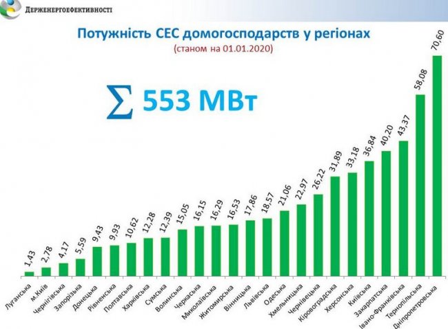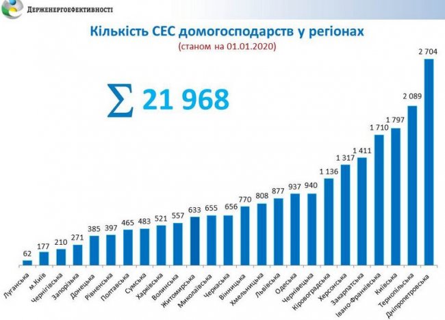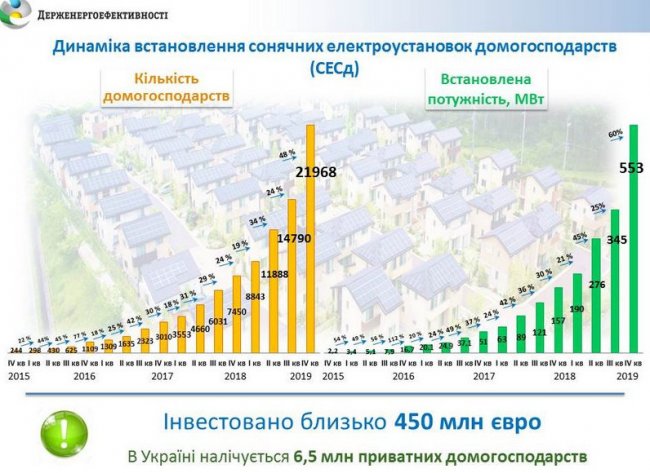 Согласно последней информации агентства Госэнергоэффективности, по состоянию на 1 января 2020 года около 22 тыс. домохозяйств в Украине используют «чистую» электроэнергию, инвестировав около 450 млн евро в солнечные электростанции (СЭС).