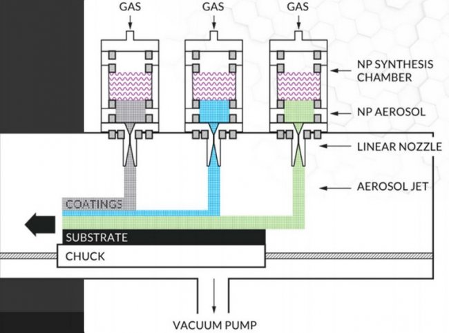 На рисунке ниже показан процесс депозиции газа, который специалисты называют «сборкой под воздействием аэрозоля». (Депозиция – химическое парофазное осаждение, с помощью которого создаются высокочистые твердые материалы. Используется, например, для создания тонкопленочных фотоэлементов). При скорости нанесения покрытия на один модуль 10 метров в минуту оборудование с программным обеспечением Swift Coat способно покрывать 300 солнечных модулей из 60 ячеек в час.