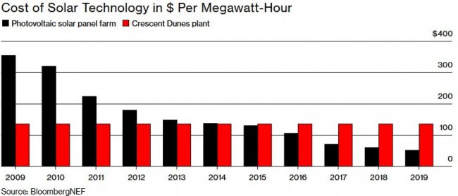 Цена на фотоэлектрические модули сильно опустилась за последние несколько лет, и они продолжают стремительно дешеветь. В тоже время, солнечные тепловые электростанции конструктивно сложны, дороги и не имеют сравнимого потенциала снижения затрат.
