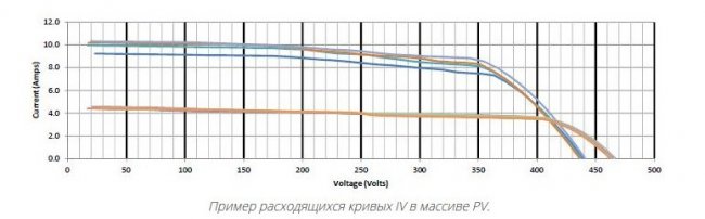 В новой фотоэлектрической установке кривые IV в каждой цепочке по сути идентичны. Со временем из-за выхода из строя и повреждения модулей, затенения и загрязнения эти кривые могут значительно расходиться. Но принцип эффективной работы системы с центральным сетевым инвентором основан на том, что все кривые IV должны быть одинаковы. В случае их расхождений результативность значительно снижается.