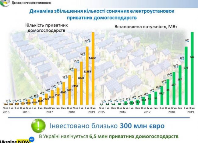 Свою долю в генерацию возобновляемой энергии в Украине вносят и небольшие домашние солнечные электростанции (СЭС) мощностью до 50 кВт. Согласно информации Госэнергоэффективности около 15 тыс. Домохозяйств в Украине уже используют «чистую» электроэнергию, инвестировав 300 млн евро в солнечные панели.