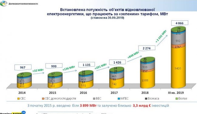За 9 месяцев 2019 года в Украине ввели в эксплуатацию 2 500 ГВт новых мощностей возобновляемой энергетики, инвестировав в отрасль более 2 млрд евро. Новые статистические данные были опубликованы на сайте Госэнергоэффективности.