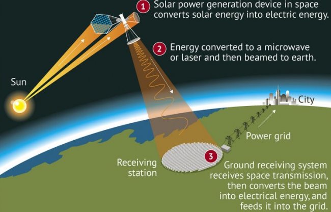 Принцип действия космической солнечной электростанции заключается в следующем: массив фотопанелей принимает беспрепятственно проходящие через космическое пространство солнечные лучи, конвертирует их в электроэнергию, которая в виде микроволн или лазерных лучей передается на Землю, на принимающую площадку, где энергия снова преобразовывается в электричество и поступает в энергосети.