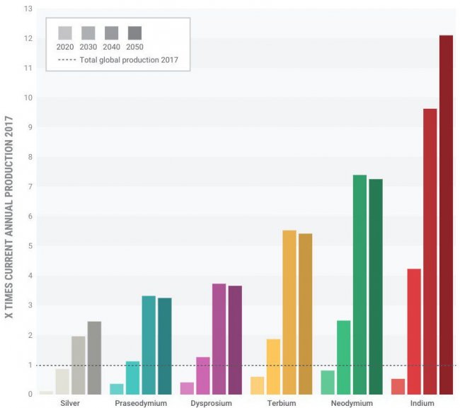 Группа исследователей из Министерства инфраструктуры Нидерландов подсчитала, какой объем этих металлов потребуется к 2050 году, чтобы произвести достаточно солнечных панелей и ветроустановок для эффективной борьбы с изменением климата. Поскольку множество стран, городов и компаний обязались полностью перейти на «чистую» энергетику или, по крайней мере, сделать ВИЭ преобладающими, количество СЭС и ВЭС должно увеличиться на порядок.