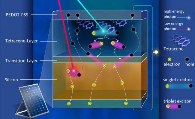 В работе, опубликованной исследователями NBZ в журнале «Materials Horizons», была описана интеграция на поверхность кремниевой солнечной батареи слоя делящихся кристаллов тетрацена толщиной всего 100 нанометров. В итоге стало понятно, что расщепление триплетных пар еще более эффективно с дополнительно введенным органическим проводником под названием PEDOT:PSS.