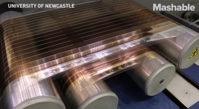 В мае прошлого года профессор Пол Дастур, работающий в Университете Ньюкасла, представил солнечную полимерную пленку, создаваемую с помощью печатиэлектронными чернилами. Фотогальванические панели толщиной менее миллиметра с двусторонним клейким покрытием внешне напоминают упаковочный материал и имеют себестоимость производства меньше $10 за квадратный метр.