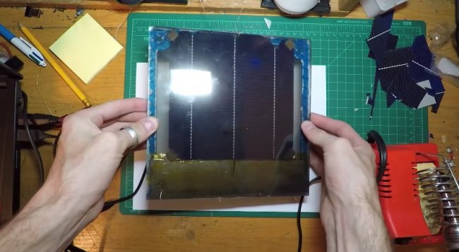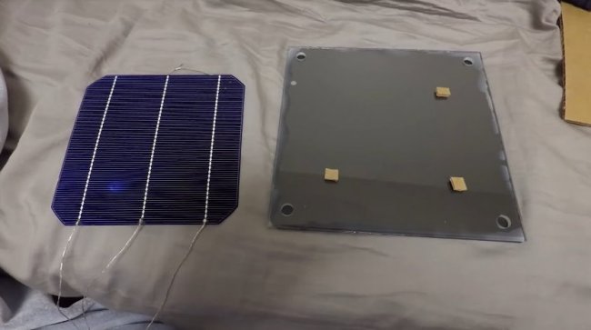 Для начала он купил в интернете фотоэлементы и спаял их в шестидюймовые квадраты. Каждая пластина имела напряжение 0.56 вольт и ток 8 ампер; благодаря конвертеру напряжение в пластине увеличилось до 3.7 вольт.