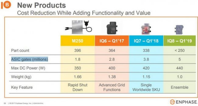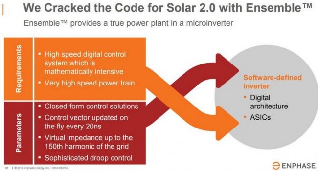 Enphase работает над уменьшением производственных расходов на микроинвертеры за счет улучшения конструкции технологии. В недавней презентации, микроинвертеры IQ6, отрекомендовали себя как умные, быстрые и энергопроизводительные. Но производитель планирует скоро выпустить на рынок свой последний преобразователь Ensemble, который будет меньше весить, включать в себя больше разъёмов ASIC и иметь увеличенную максимальную мощность. Технология будет доступна в 2019 году.
