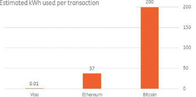Согласно отчёту голландского банка ING, на одну транзакцию биткоина может расходоваться такое же количество энергии, которое может питать весь дом на протяжении месяца. Эта процедура использует так много электричества с тем, чтобы верификация сделок обходилась дороже и, как следствие, приводила к уменьшению возможности мошенничества и злоупотребления криптовалютой.