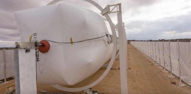 Надувные цилиндрические концентраторы длиной 220 м можно легко транспортировать в стандартном контейнере, а затем разворачивать на территории солнечных электростанций. Они способны обеспечить стократную концентрацию света и нагревают теплоноситель до температуры 400-600° С, чего вполне достаточно для питания вырабатывающих электричество паровых турбин.