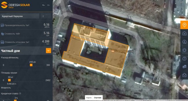 Чтобы воспользоваться Odessasolar, необходимо выбрать здание на карте, определить тип дома, после чего, исходя из соотношения площади крыши здания и полезных коэффициентов, программа рассчитает все параметры, начиная от необходимых инвестиций и заканчивая сроками их возврата.