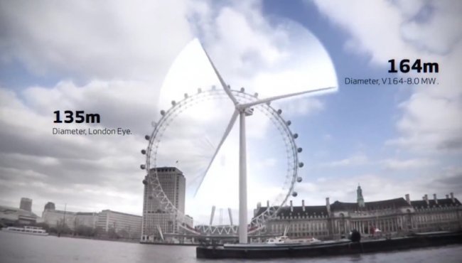 Высота новой турбины составляет около 220 метров, а длина ее 38-тонных лопастей — порядка 80 метров. При этом площадь описываемой лопастями поверхности превышает 21 000 м2, что даже больше, чем площадь лондонского колеса обозрения London Eye.