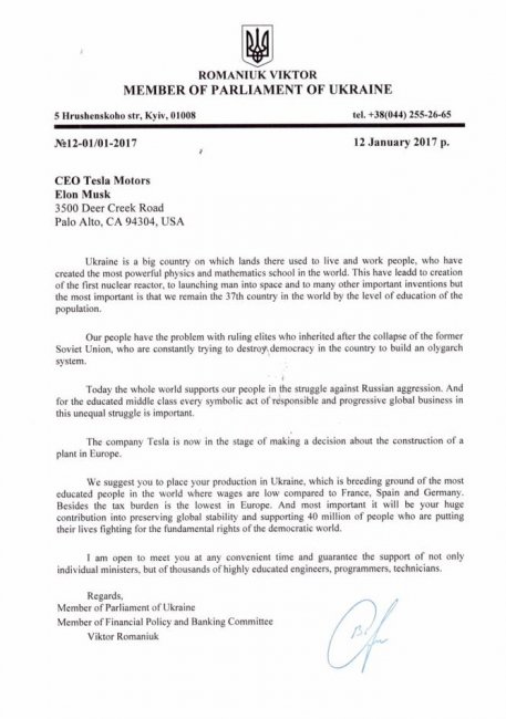 Но в ситуацию решил вмешаться украинский депутат от «Народного фронта» Виктор Романюк. Он обратился напрямую к основателю компании Илону Маску с предложением в качестве локации для завода выбрать Украину. Об этом депутат сообщил в Facebook, выложив и скан самого письма.