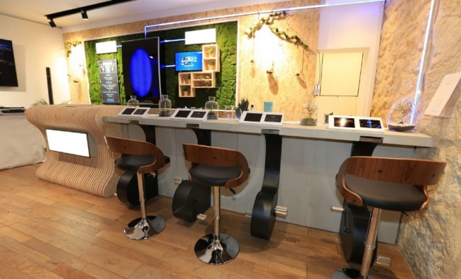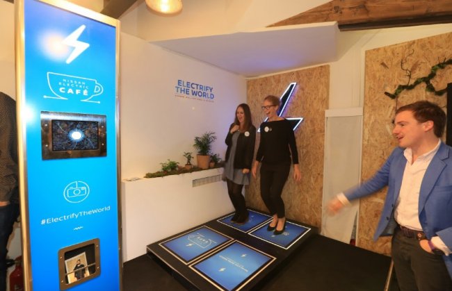 Nissan сотрудничал со многими техническими и энергетическими компаниями, воплощая в жизнь идею Nissan Electric Café. И вот теперь, проходя по коридору, выложенному специальной плиткой компании Pavegen, которая использует принцип электромагнитной индукции, посетители тем самым будут вырабатывать электроэнергию. Они также могут испытать фотостудию от Pavegen, где им нужно будет прыгать на плитках, вырабатывая энергию для того, чтобы сделать снимок. Среди прочего в кафе есть инновационная система барных сидений компании WeWatt, сидя на которых клиенты крутят педали, вырабатывая электричество, а в награду получают напиток по своему выбору.