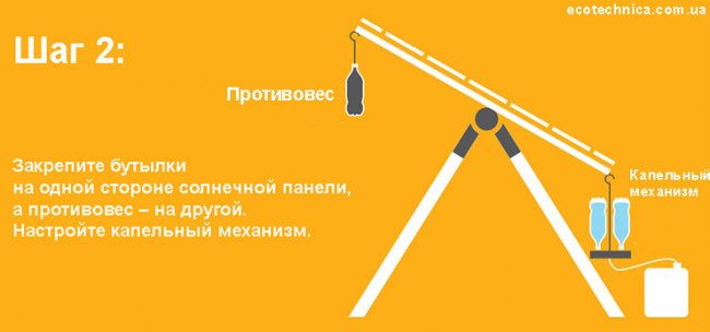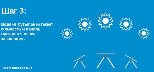 Шаг 3: Вода из бутылок истекает в емкость и панель вращается вслед за солнцем.