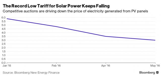Таким образом, стоимость самых дешевых предложений на рынке солнечной энергетики за прошедший год снизилась почти на 50%. Это самая низкая цена чистой энергии, зафиксированная на сегодняшний день. Но рекорд вряд ли продержится долго. На тендерах 2015 и 2016 года в США и других странах наметилась тенденция к резкому снижению цены. За последние 16 месяцев себестоимость электроэнергии в том же Дубае упала почти в два раза.