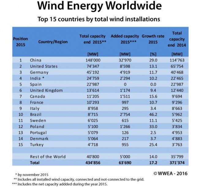 Мировой прирост ветроэнергетики в 2015 году составил 17,2%, что заметно отличается от 2014 года с его 16,4%. Самое стремительное развитие ветроэнергетический рынок получил в Бразилии, Польше, Китае и Турции – в этих странах динамика прироста показала наивысший уровень. Китай по-прежнему занимает первое место в этом списке, причем страна также стала мировым лидером и в отрасли солнечной энергетики.
