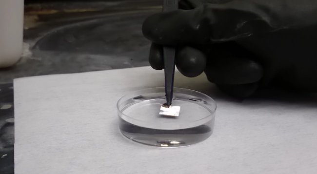 Ученые погрузили кремниевую пластину вместе золотой пленкой на поверхности в раствор перекиси водорода и плавиковой кислоты. При этом металл стал моментально погружаться в подложку и на месте отверстий образовались наностолбцы кремния. Вместе с тем, блестящая золотая поверхность поменяла свой цвет на темно красный – свидетельство того, что золото перестало отражать свет.