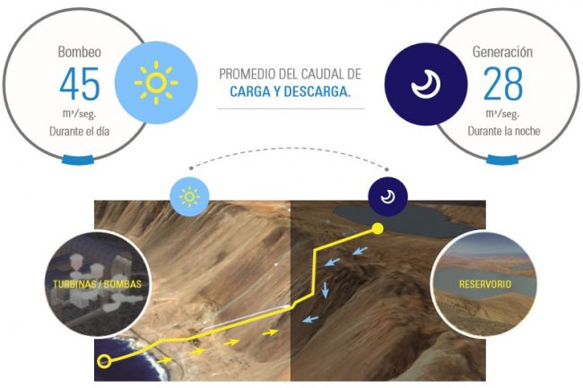 Затем, по мере необходимости, вода из горных водоемов будет спускаться и приводить в движение турбины, которые, в свою очередь, опять начнут вырабатывать электроэнергию. Помимо аккумуляции энергии, это делается для того, чтобы «выровнять» непостоянную генерацию солнечных электростанций, которые, как известно, простаивают в ночное время суток.