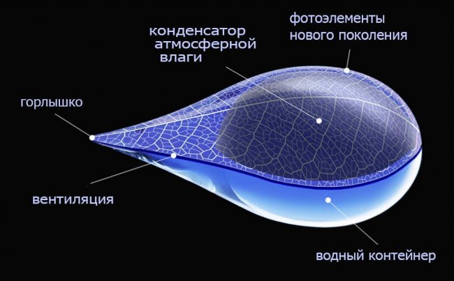 В основе WaterDrop, как и в других концептах нидерландского изобретателя, лежит следующая солнечная технология: в течение светового дня фотогальванические элементы на обратной стороне устройства должны абсорбировать энергию солнца, затем эта энергия используется чтобы остудить воздух и получить конденсат, а также чтобы питать вентилятор для создания воздушного потока. Теоритически, образующиеся капли воды должны собираться в небольшую емкость. Ап рекомендует использовать в его девайсе небольшие природные камни, которые помогут насытить воду необходимыми минералами, «горлышко» же устройства будет вмещать в себе сменный угольный фильтр.