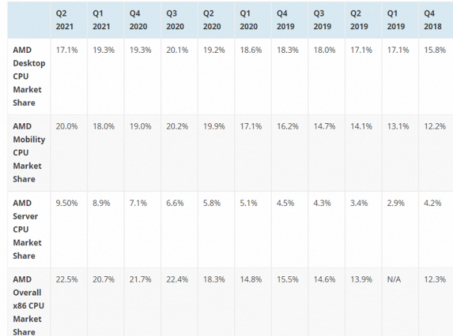 Если говорить более подробно, на рынке настольных CPU доля AMD даже снизилась в годовом выражении с 19,2% до 17,1%, что, возможно, обусловлено имевшимся дефицитом процессоров. В мобильном сегменте AMD сейчас занимает 20%, что лишь на 0,1 п.п. больше, чем год назад, но на 2 п.п. больше, чем кварталом ранее.