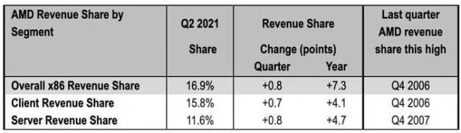 Согласно последним данным Mercury Research, по итогам второго квартала текущего года AMD заняла 16,9% рынка, что на 0,8 процентного пункта выше показателя кварталом ранее и на внушительные 7,3 п.п. выше, чем годом ранее.