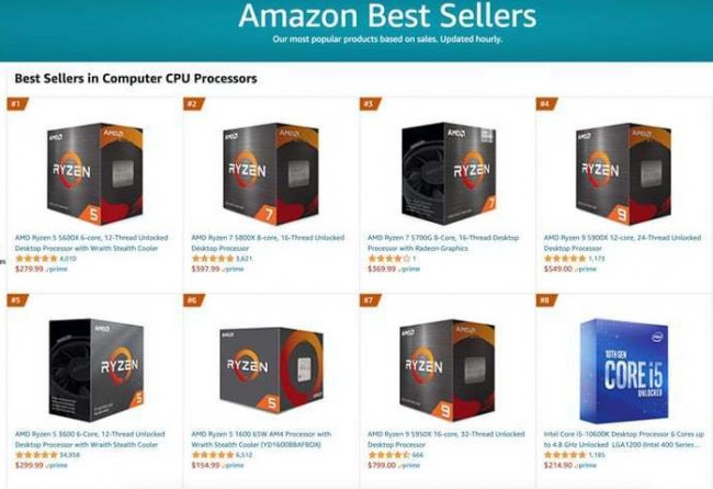 Причём в случае Amazon на шестом месте расположился старенький Ryzen 5 1600. И он продаётся там лучше любого CPU Intel.