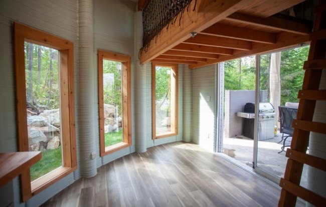 Канадский «Дом Фибоначчи» напоминает проект Apis Cor, первый созданный путем 3D-печати дом в России. Площадь здания всего 35 м2. Его интерьер прост, большая часть внутреннего пространства отведена под гостиную, через большие окна которой видны живописные сельские пейзажи. К основной комнате примыкает мини-кухня и ванная, в которой находятся душ, туалет и раковина.