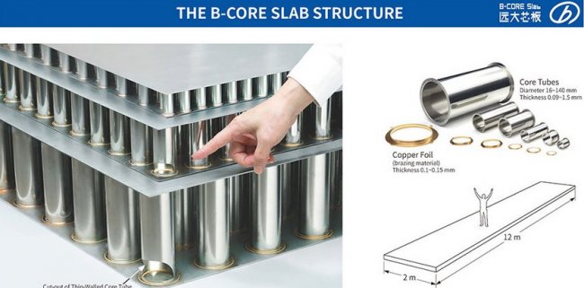 В качестве перекрытий используются разработанные Broad Group плиты B-CORE. Они состоят из двух стальных листов, соединенных между собой по всей площади огромным количеством коротких труб, установленных вертикально. По словам компании, такое решение в 10 раз легче и в 100 раз прочнее традиционных конструкций.