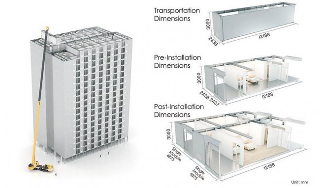 Базовые элементы новой системы — изготавливающиеся на заводе модули. В их основе лежит каркас из нержавеющей стали. На нем закрепляются все обычные для жилого помещения компоненты, включая теплоизоляцию, электропроводку, сантехническое оборудование, остекление, систему вентиляции и отделку.