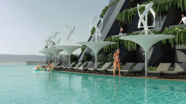 Электроснабжение Eco-Floating Hotel обеспечат солнечные батареи, ветровые турбины, а также подводная система генераторов приливного потока, которая будет вырабатывать энергию за счет движений водных массивов.