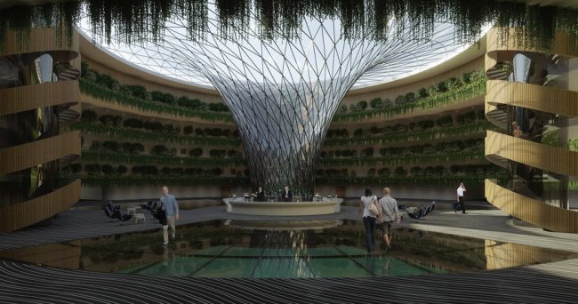 Представленный концепт оснащен огромной стеклянной крышей, выполненной в форме воронки. Она напоминает разработанный для аэропорта Сингапура водопад Моше Сафди и выполняет ту же функцию — собирает дождевую воду, которая затем используется для полива и других нужд отеля.