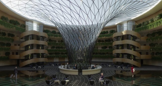 Общая площадь отеля составит 35 тысяч квадратных метров. Центральное здание получит дизайн торообразной четырехуровневой конструкции. На ее фасаде расположат зеленые насаждения.