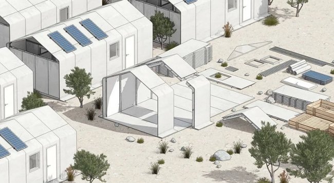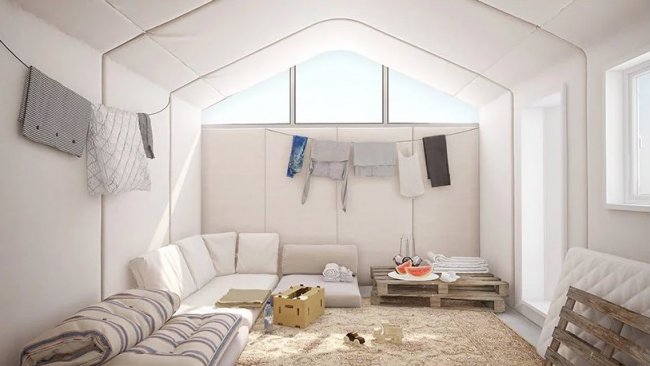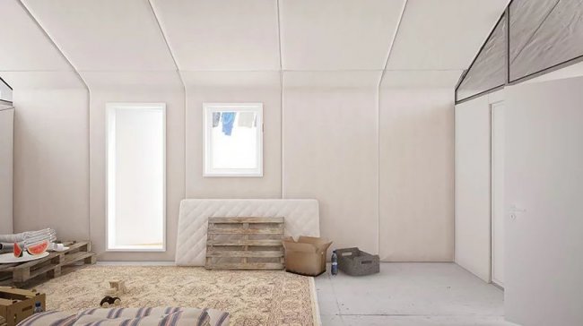 Архитектурная студия Cutwork представила концепт бетонного дома для лагерей беженцев, на строительство которого потребуется не более суток. Дома поставляются на место возведения в виде комплектов текстильного материала со специальным покрытием, и для установки бетонной палатки в него достаточно добавить обычной воды.