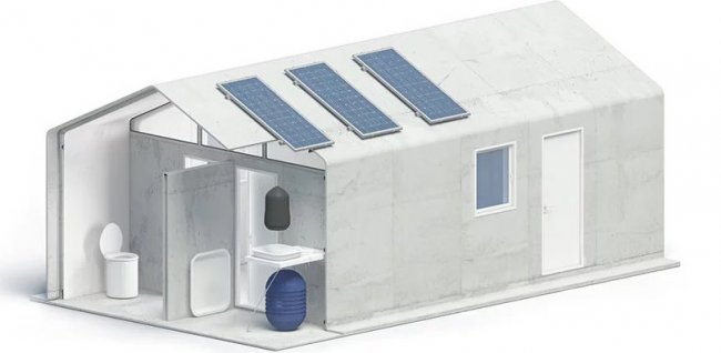 Утеплитель из моющегося материала крепится внутри дома, и благодаря этим таким матам дом становится более уютным и комфортным для жизни. В одном из сводов дома предусмотрена установка окна для естественного освещения. Жилище имеет площадь 24 кв. м, достаточно большую гостиную-спальню и раздельные санузел и душевую. На крыше устанавливаются несколько солнечных модулей, обеспечивающих определенную степень автономии.