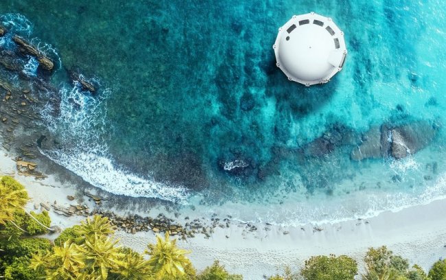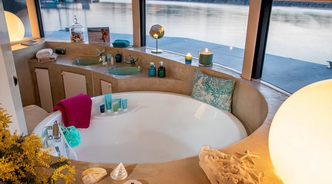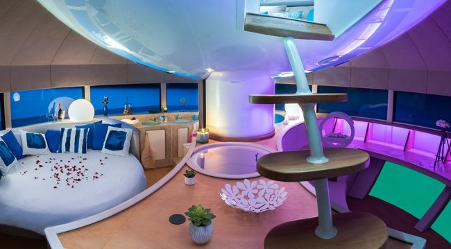 В дом площадью 50 кв.м. можно войти через поднимающуюся дверь-люк. На первом этаже водного особняка оборудована гостиная зона с диваном и мини-баром, из которой открывается шикарный вид на море. В следующей зоне располагается круглая кровать и ванная комната с двумя раковинами и ванной.