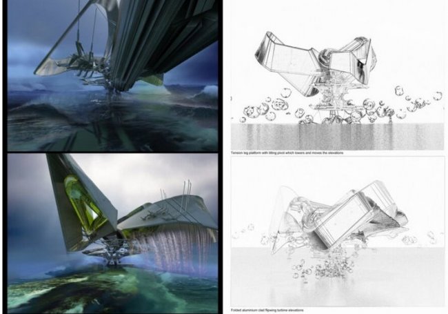 Дизайнерская компания Margot Krasojević Architecture, базирующаяся в Пекине, подготовила проект по превращению нефтяной вышки на южнокорейском побережье в футуристический отель-маяк. Сооружение расположится на платформе с поворотными подводными турбинами, которые будут поглощать энергию приливов океана.