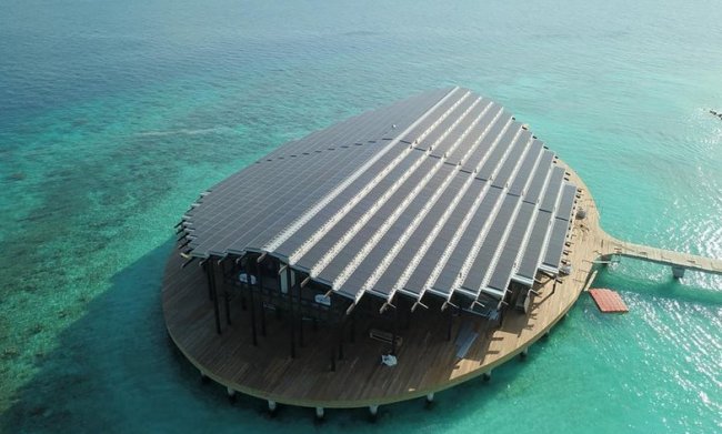 Нью-йоркское архитектурное бюро Yuji Yamazaki Architecture (YYA) разработало концепцию энергетически независимого курорт-отеля, которая реализована на частном острове Атолл Лхавийани под брендом Kudadoo Maldives Private Island. Идею энергетической автономности отеля удалось реализовать благодаря монтажу огромной фотоэлектрической крыши. Архитекторы приложили максимум фантазии для того, чтобы солнечные панели гармонично вписались в дизайн-проект острова и наглядно продемонстрировали возможности применения ВИЭ в эко-туризме.