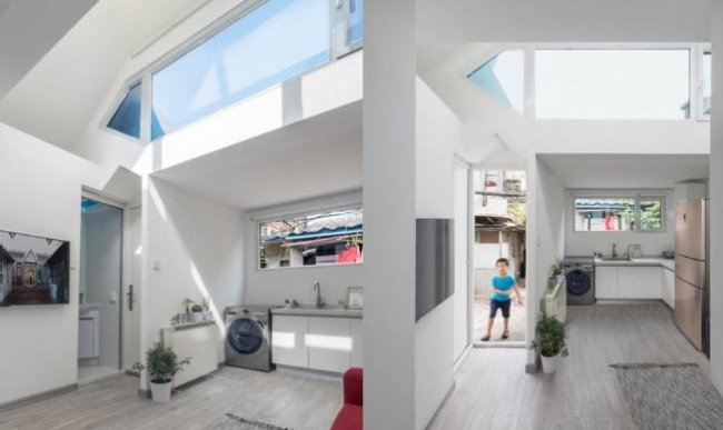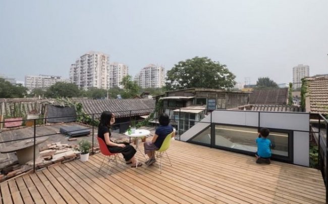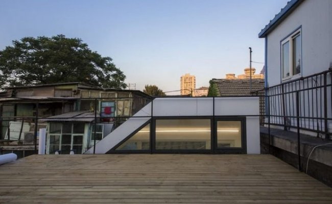 Площадь модульного мини-дома составляет всего 27 квадратных метров, но это функциональное жилье за смешные, по пекинским меркам, деньги. Помимо светлой комнаты с двумя ярусами окон, которые снижают потребность в искусственном освещении, в доме есть просторная кухня, а терраса на крыше увеличивает жилое пространство и открывает замечательных вид на город. Проблема с подключением к дому канализации решается с помощью биотуалета и компактного душа.